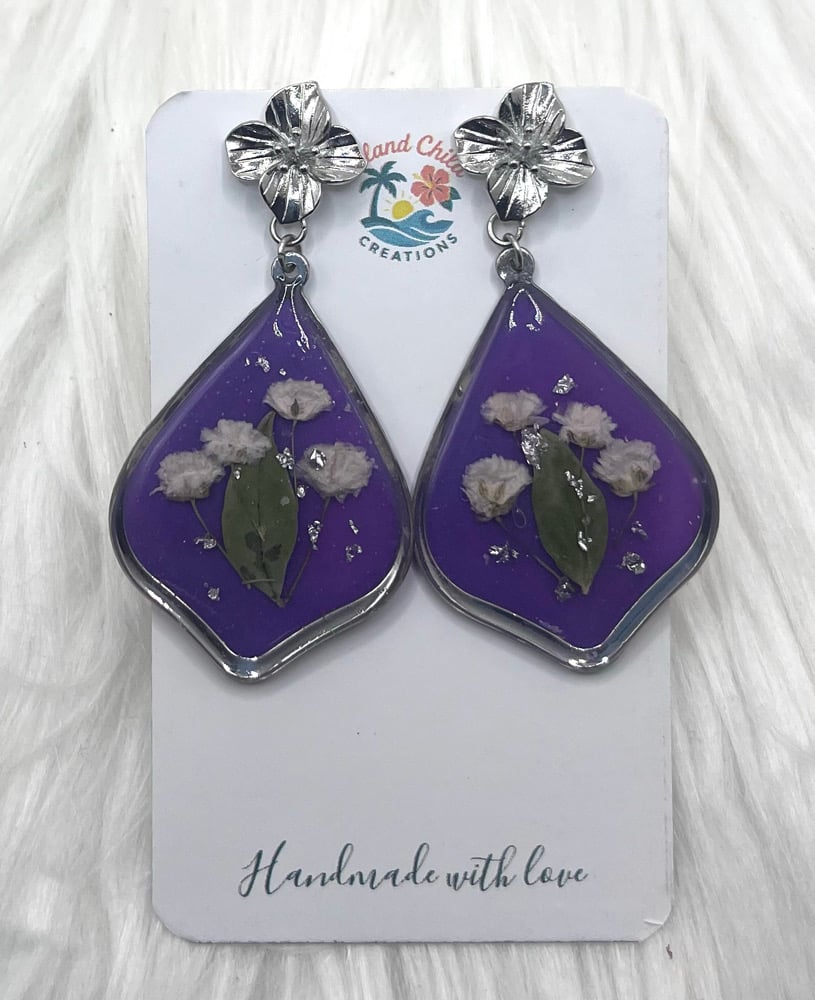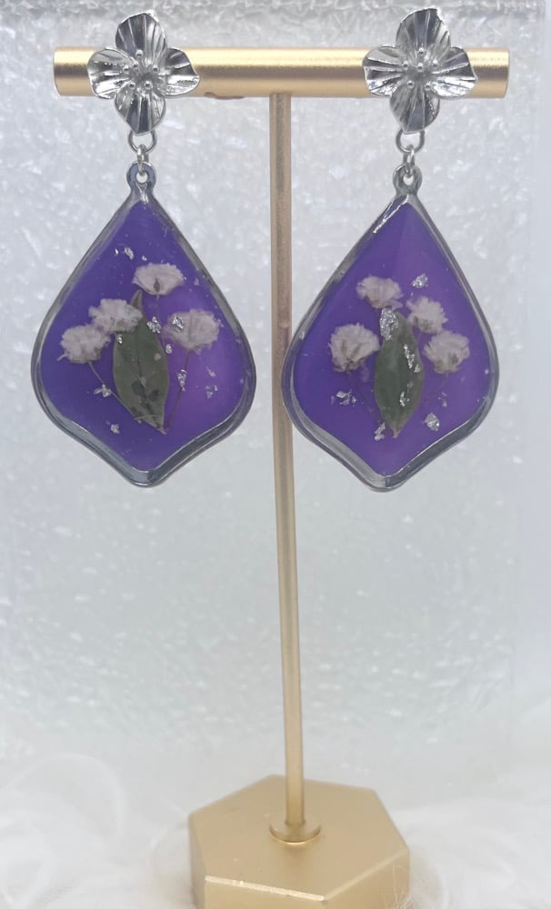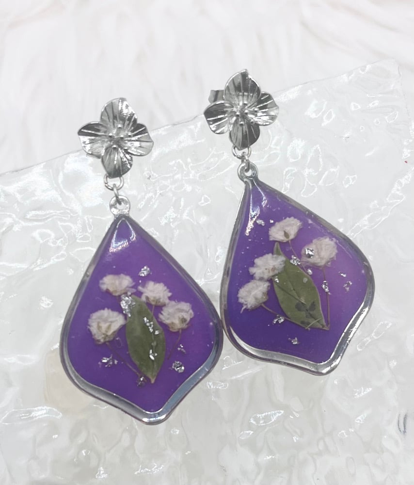 These gorgeous dangles have white pressed flowers and silver flakes embedded in purple tinted resin. Hypoallergenic, lead and nickel-free.