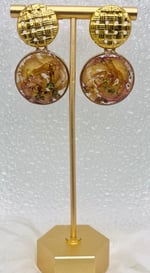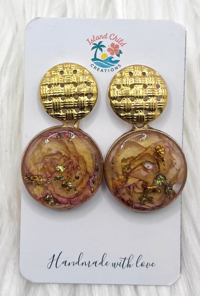 These gorgeous dangles have the center of a rose, gold/bluish metallic flakes and embedded in clear resin. Hypoallergenic, nickel & lead-free!